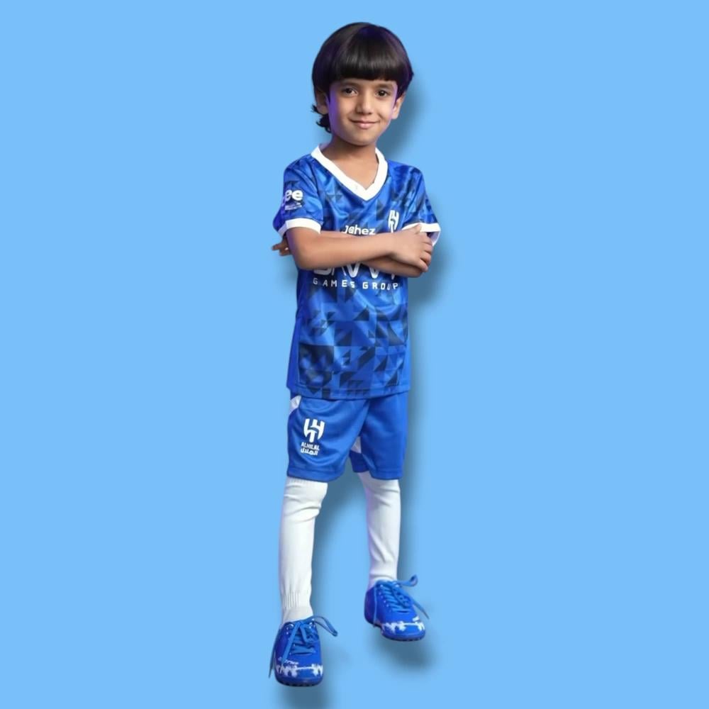 تمتع بتميز اطفالك بأحدث طقم الهلال السعودي بتصميم أنيق وعصري بلون الأزرق النابض الحيوية الذي يعكس هوية النادي العريقة. الطقم مصنوع من خامات قطنية عالية الجودة.